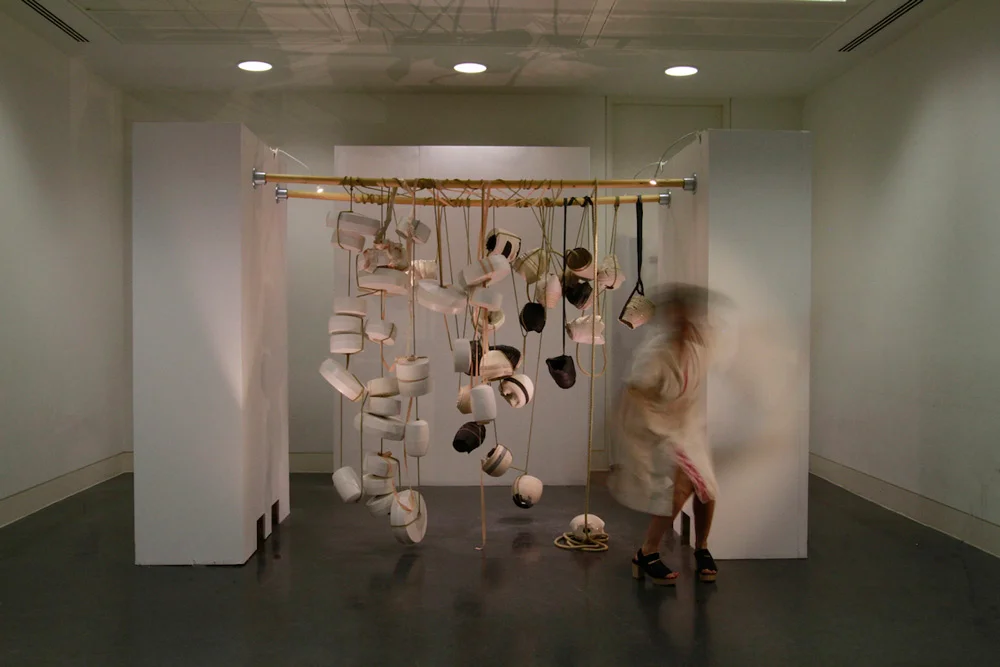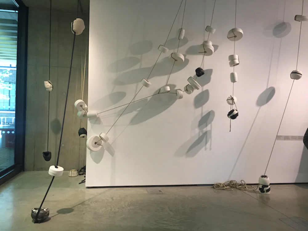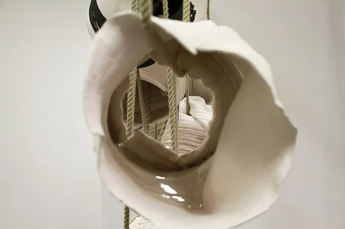 The material qualities of clay and the contrasting processes of slip casting verses thrown on the wheel act to express the artists themes within this installation of balance, tension, vulnerability.