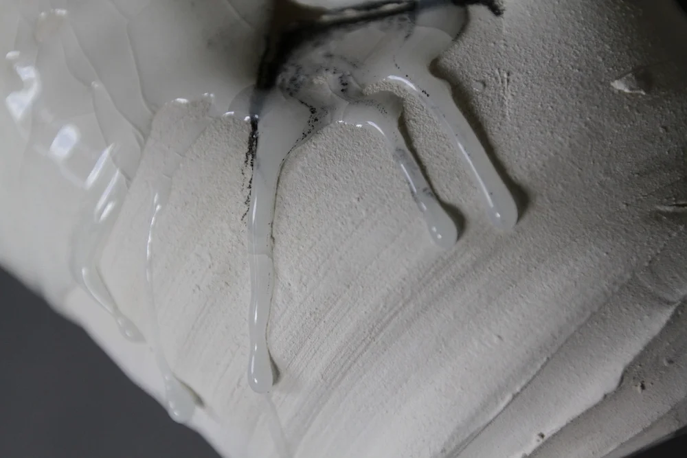 The work was made from the same weight of clay materials as the makers body weight, both plastic clay and casting slip. Through this personal physical gesture the scale of the work was determined.